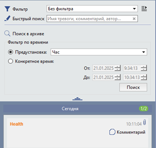 Помимо фильтрации текущих тревог оператору доступен поиск инцидентов в архиве по заданному интервалу времени. Вне зависимости от режима вывода и настроек фильтрации в базе данных сохраняются все инциденты.