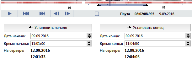 В правой части окна расположены настройки выбранного фрагмента архива. При помощи курсора мыши, перемещаясь по временной шкале, определите начало фрагмента. При необходимости, скорректируйте значения в полях Дата начала и Время начала. Для того чтобы зафиксировать выбранное время в качестве точки начала экспортируемого фрагмента нажмите на кнопку Установить начало.