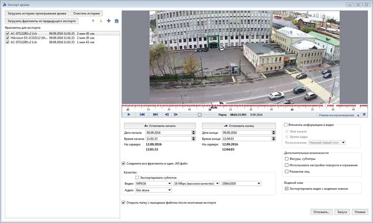 Для экспорта одного или нескольких фрагментов архива в видеофайл необходимо: