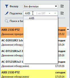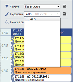 - подсветка по фильтру - в этом режиме для подсветки выбирается созданные ранее фильтры. Это удобно, если список событий уже отфильтрован, но в нем нужно подсветить события по некоторому признаку. В этом случае нужно в выпадающих списках Фильтр и Подсветить выбрать требуемые фильтры.