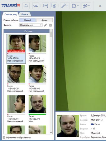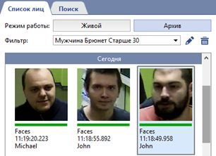 Отображение лиц происходит в двух режимах Живой и Архив. Первый отображает распознанные лица в реальном времени, а при включении второго отключается автообновление журнала распознавателя лиц. Запись в журнале состоит из: