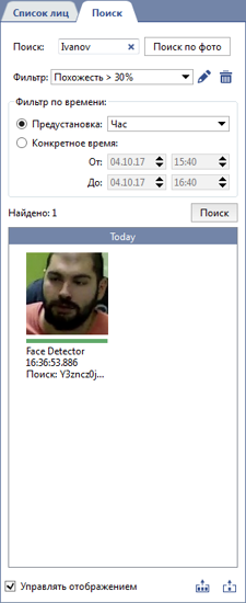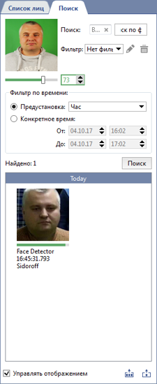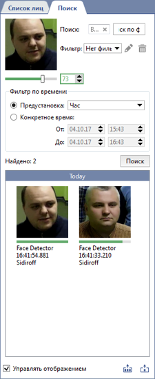 Поиск по лицу и фото возможен если в настройках модуля включена соответствующая функция. Подробное описание этой функции смотрите в Руководстве администратора в разделе Основные настройки распознавателя лиц.