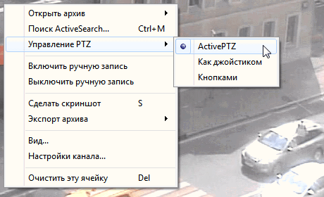 - Нажмите правую кнопку мыши и в открывшемся контекстном меню выберите пункт Управление PTZ -> ActivePTZ. Обратите внимание, что данный режим будет доступен только в том случае, если камера откалибрована (т.е. в настройках сервера проведен анализ оптики).