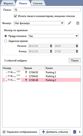 Номера всех транспортных средств сохраняются в базе данных вне зависимости от выбранных установок фильтрации. В любой момент Вы можете обратиться к списку распознанных автомобильных номеров и узнать, какие транспортные средства проезжали в тот или иной момент времени.