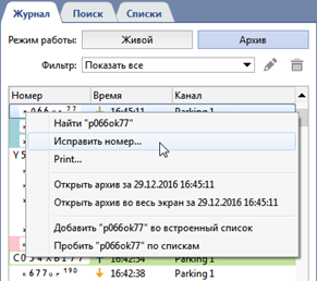 - открыть архив в момент когда номер был распознан (в текущем окне или на весь экран);