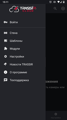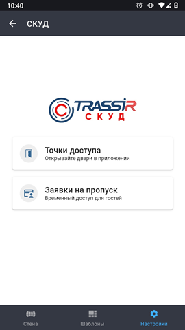 - В мобильном приложении должно быть настроено локальное или облачное подключение к серверу, на котором запущен модуль TRASSIR СКУД.