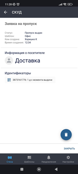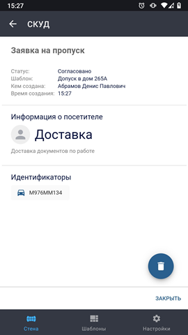 - Пропуск выдан - пропуск активен и посетитель может им воспользоваться;