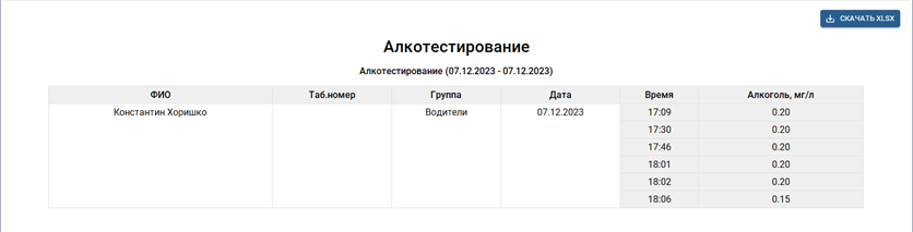 Алкотестирование - отчет, содержащий информацию о результатах тестирования персон на наличие алкоголя в их организмах.