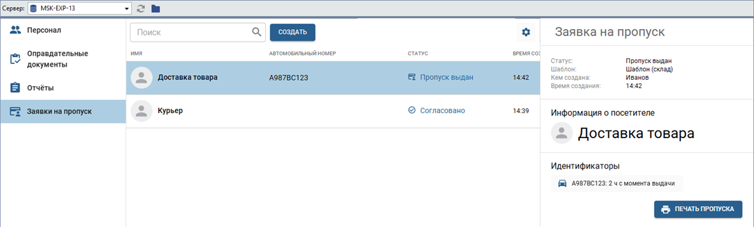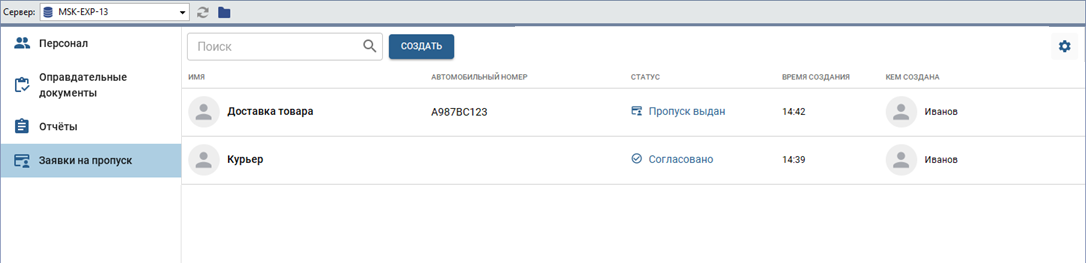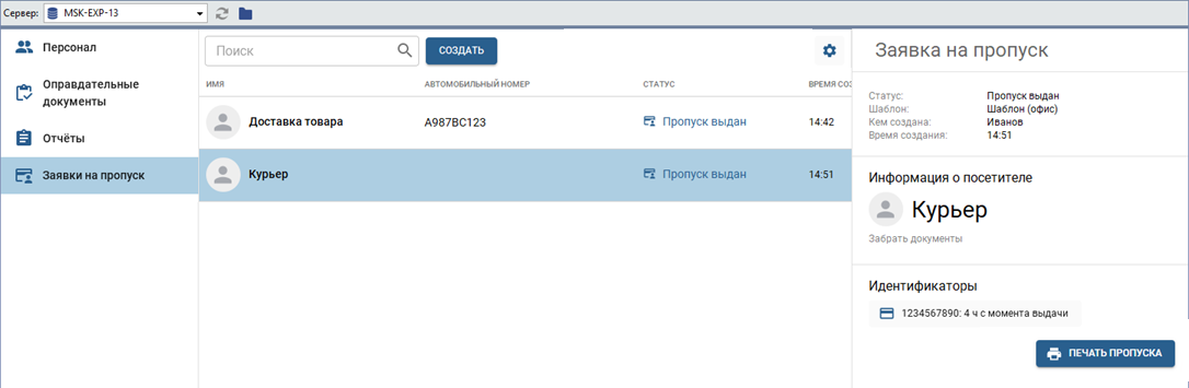 - заявки на пропуск, созданные другими персонами, если вы являетесь лицом подтверждающим заявки на пропуск и выдающим их посетителям, или администратором заявок.