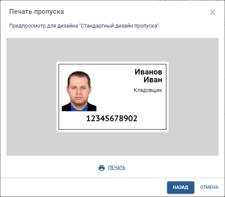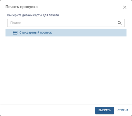Если необходимо распечатать пропуск, то вы можете сделать это нажав на кнопку Печать пропуска и, выбрав в открывшемся окне вариант дизайна макета пропуска.