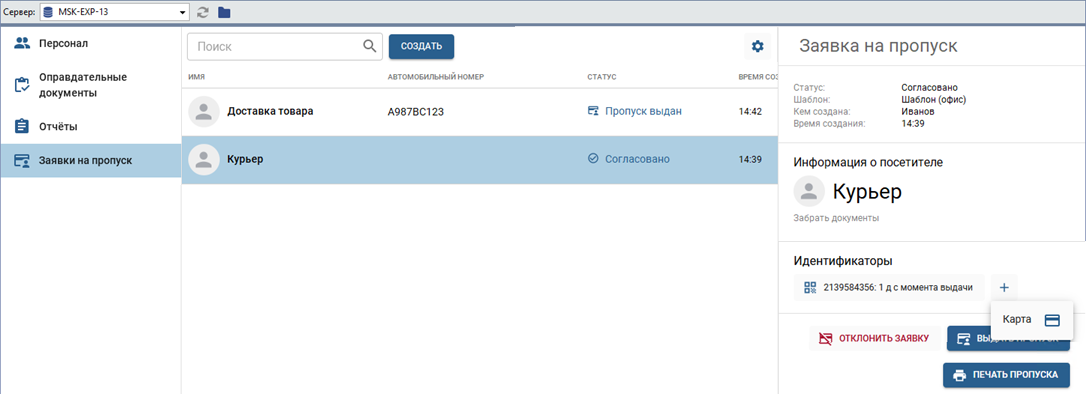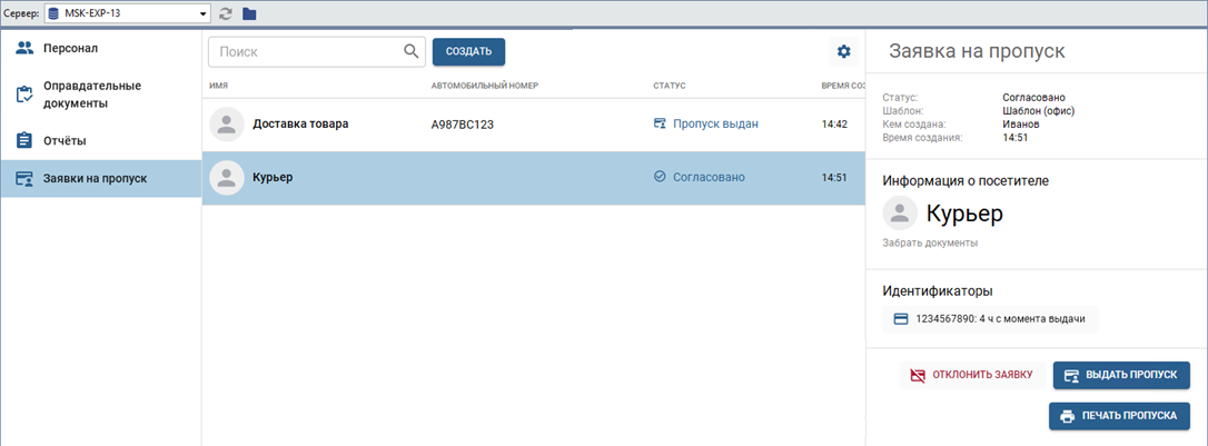 Для подтверждения заявки нажмите на кнопку Выдать пропуск или кнопку Отклонить заявку чтобы ее отменить.