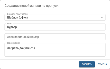 Чтобы создать заявку на пропуск, нажмите кнопку Создать, выберите Шаблон посетителя и введите все данные о посетителе.