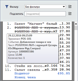 - Копировать в буфер - копирование в буфер обмена данных о выбранной позиции чека. В буфер копируются те же данные, которые отображаются для позиции чека во всплывающей подсказке.