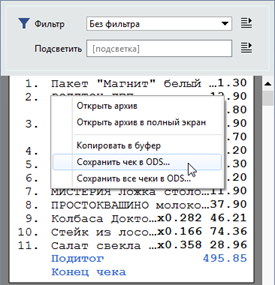 - Сохранить чек в ODS... и Сохранить все чеки в ODS... - сохранение выделенного чека или всех чеков в формате OpenOffice.org Calc.