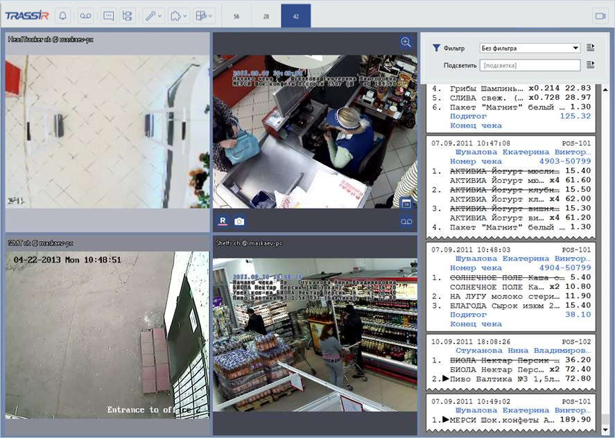 - Открыть архив - отображение архивного видео, связанного с выбранной позицией чека. Если на экране отображена сетка из камер, то окно архива будет отображено в одной из ее ячеек.