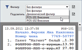 Кроме этого, для отображения чеков конкретного терминала вы можете использовать динамический фильтр. Данный фильтр отображает чеки только того кассового терминала, видео которого отображается в данный момент в окне просмотра. Если Вы переключитесь на видеокамеру другого кассового терминала, то автоматически изменится и список чеков - будут отображены только чеки нового терминала. Для применения динамического фильтра необходимо раскрыть выпадающий список Фильтр и выбрать пункт Динамический фильтр.