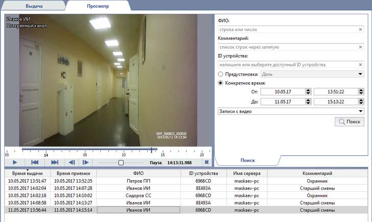 На вкладке Просмотр вы можете найти и просмотреть видеоархив, сохраненный со всех ПВР, которые подключались к серверу.