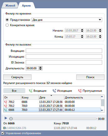 Чтобы прослушать найденный звонок, выберите его из списка. При этом с сервера IP-телефонии будут загружены аудиоданные. Для