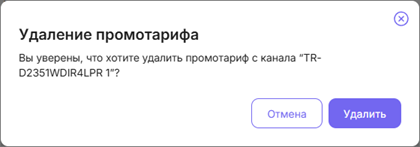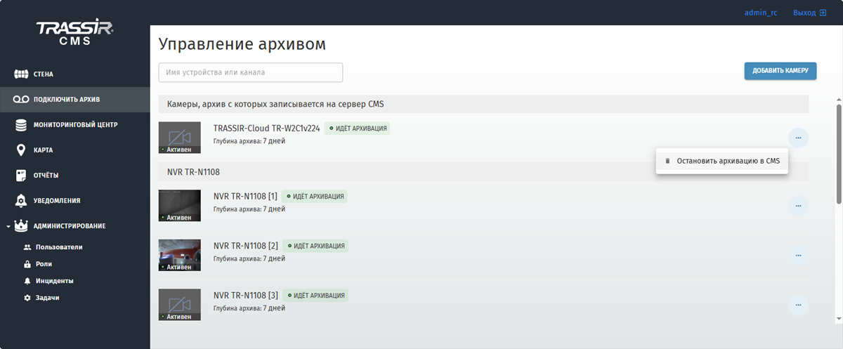 Для прекращения записи архива нажмите кнопку напротив камеры в списке и выберите Остановить архивацию в CMS. Подтвердите удаление тарифа, нажав кнопку Удалить.
