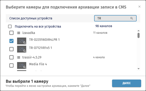 Нажмите кнопку Добавить камеру, чтобы выбрать устройства для подключения и настроить архивацию. Укажите срок хранения архива и максимальный битрейт для основного и дополнительного потоков. Для сохранения настроек нажмите Применить.