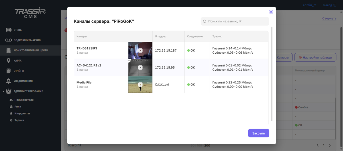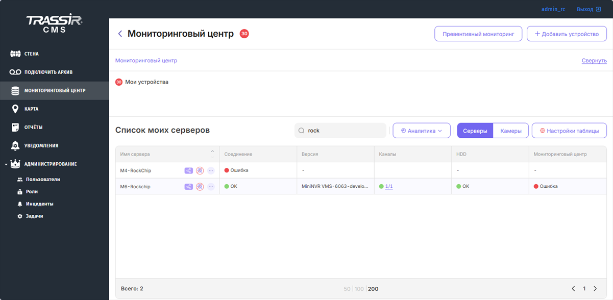 К TRASSIR Central Management System можно подключить IP-камеры, видеорегистраторы и серверы. На вкладке Мониторинговый центр находится список всех подключенных устройств.