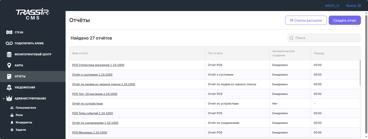 Для анализа работы системы видеонаблюдения в TRASSIR CMS можно создавать следующие отчеты: