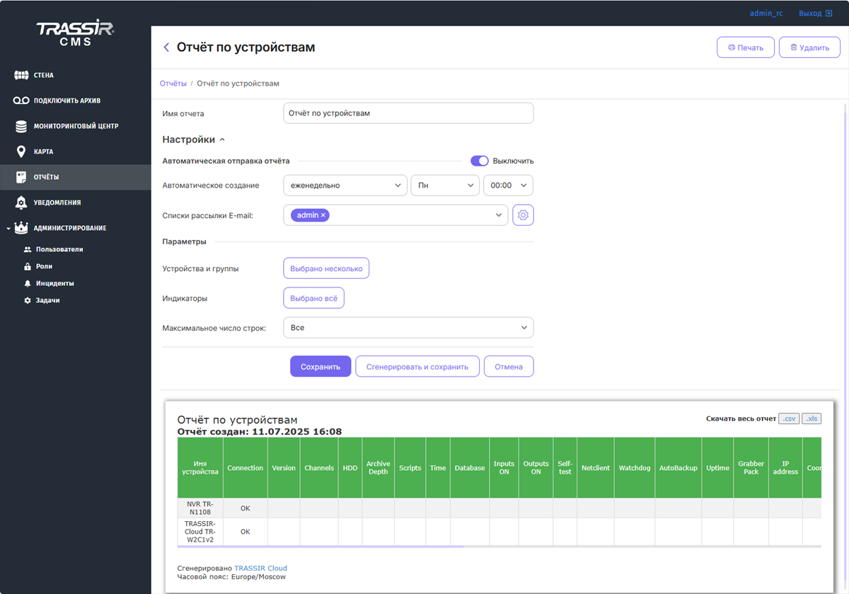 Созданный отчет можно скачать в форматах CSV и XLS, распечатать или удалить, нажимая соответствующие кнопки.