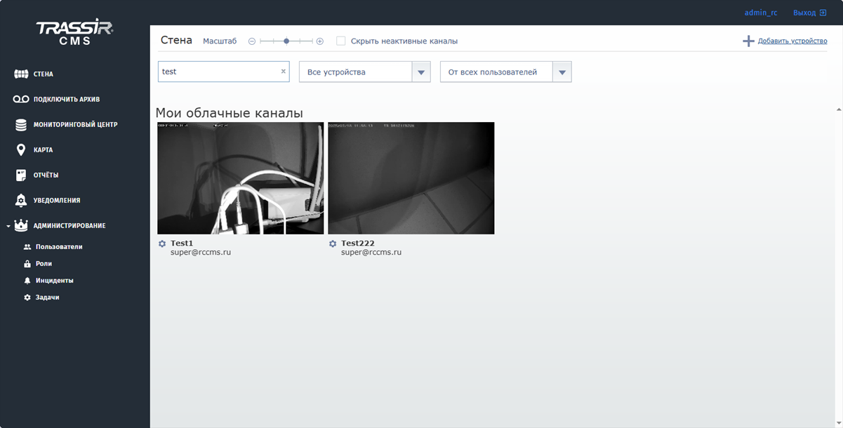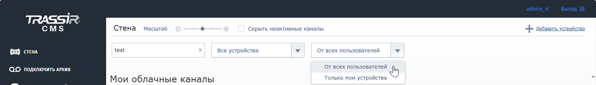 По умолчанию, на стене TRASSIR CMS отображены все подключенные устройства и каналы. Установите флаг Скрыть неактивные каналы, чтобы скрыть каналы, для которых доступен только архив. Изменяя Масштаб можно настроить размер превью, а с помощью фильтров найти устройство или канал по имени или отобразить только определённые каналы.