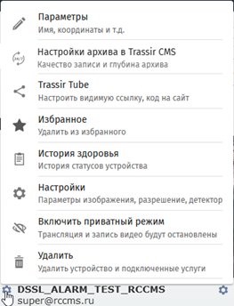 Раздел Стена также позволяет изменять настройки любого добавленного устройства в TRASSIR CMS. Нажав на кнопку в списке рядом с названием канала можно: