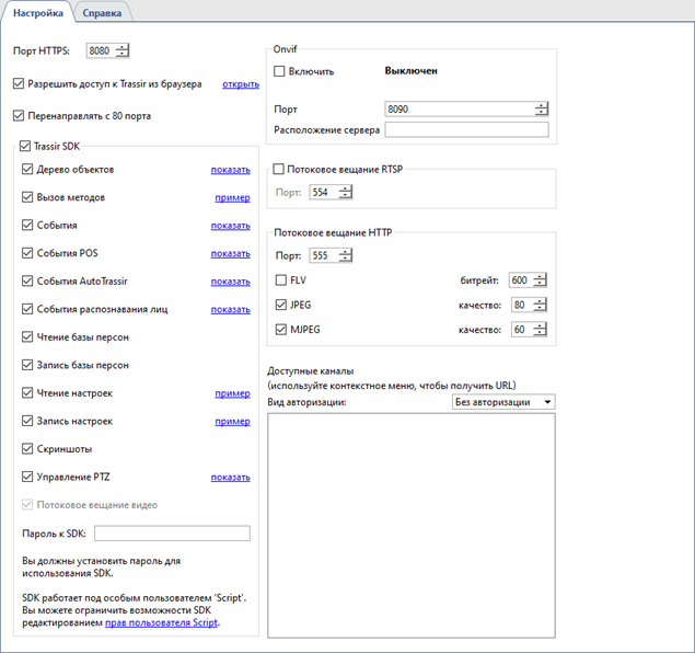 Для того, чтобы включить возможность обращаться к серверу TRASSIR через SDK, поставьте флаг SDK.