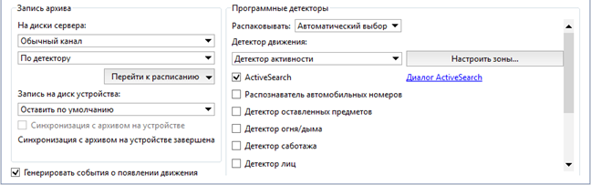 Для активации модуля на канале необходимо в Настройках канала в группе настроек Программные детекторы выбрать пункт ActiveSearch. В случае необходимости поиска в архиве нажмите на ссылку Диалог ActiveSearch.