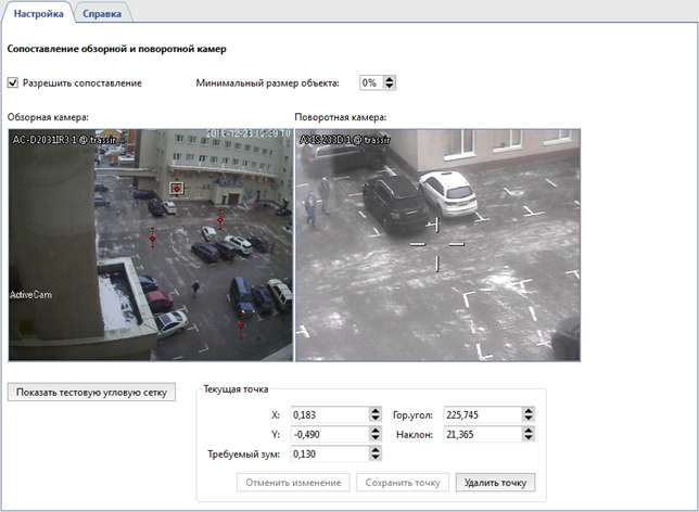 Необходимо задать минимум 3 точки. Проверьте позиционирование поворотной камеры в различных областях. Если камера позиционируется не точно, то создайте в этой области дополнительную точку. К примеру, более точная настройка может потребоваться если обзорная и поворотная камера находятся на значительном расстоянии друг от друга.
