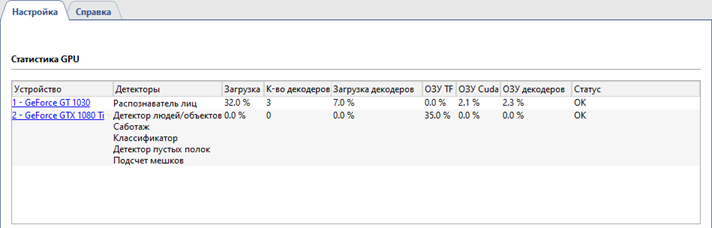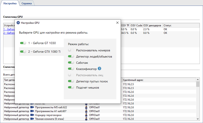 Список переключателей в Режиме работы определяет для каких детекторов и модулей видеоаналитики будет использоваться эта GPU. Количество одновременно работающих детекторов зависит от производительности GPU и чем она выше, тем больше детекторов может быть включено.