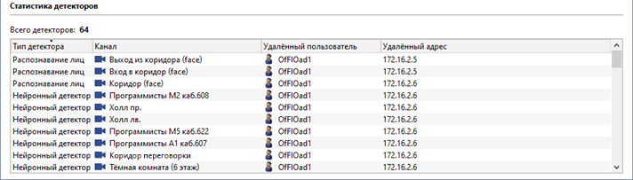 Статистика детекторов показывает на скольких локальных и удаленных каналах запущены детекторы и модули видеоаналитики, которые используют вычислительные ресурсы сервера аналитики. Для удаленных каналов отображается имя пользователя и адрес подключенного сервера.