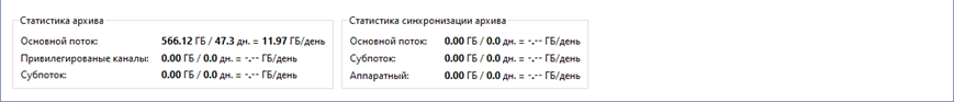 В нижней части окна отображена общая статистика архива. Вы можете посмотреть глубину дней и общий объем данных отдельно по основному и дополнительному потокам, а также статистику по привилегированным каналам. Здесь же представлен расчет требуемого дискового пространства для хранения одного дня архивных записей.