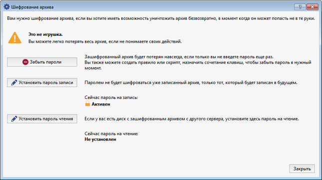 Если вы ранее уже активировали функцию шифрования архива, но захотели изменить используемый пароль, то при назначении нового пароля вы можете поставить флаг Сделать текущий пароль на запись паролем на чтение. В этом случае, архив зашифрованный старым паролем станет недоступным и для получения к нему доступа необходимо будет в качестве пароля чтения ввести пароль, который был до этого.