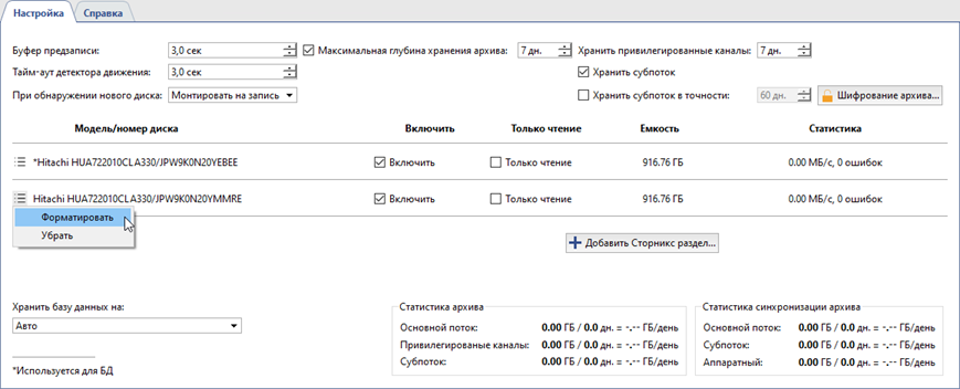 В верхней части расположены основные настройки архива. Ниже отображен перечень используемых системой дисков (в том числе сетевые диски, внешние жесткие диски, флеш-накопители и др.), их статистика и настройки.