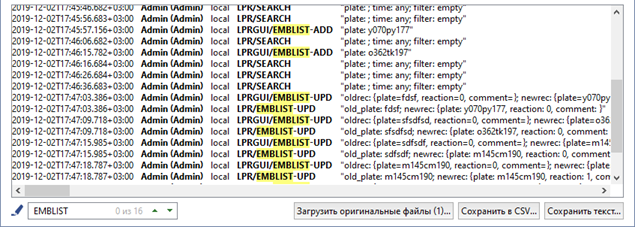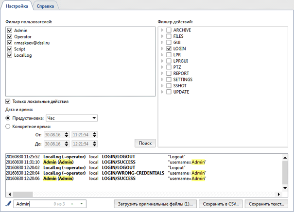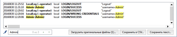 В случае необходимости полученный журнал действий можно сохранить в файл. Для этого нажмите на кнопку Сохранить в CSV... или Сохранить текст....