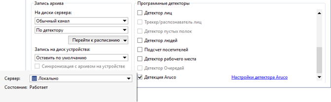 Для активации модуля необходимо в Настройках канала в области Программные детекторы выбрать пункт Детекция ArUco и выбрать Сервер, который будет производить расчет аналитики. Для открытия окна настройки нажмите на ссылку Настройка детектора ArUco.