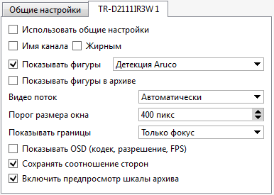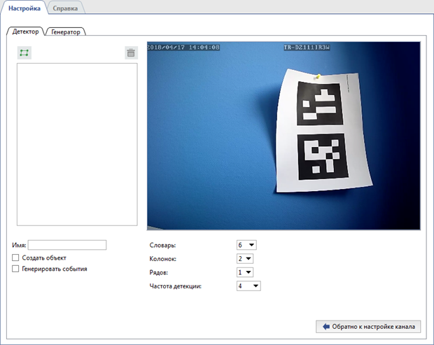 Для отслеживания изменений в работе детектора включите на канале отображение фигур Детекция ArUco (см. раздел Настройка внешнего вида окна камеры).