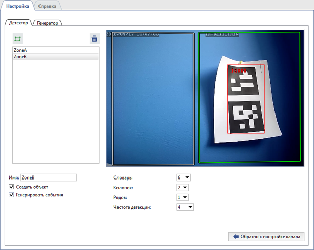 На вкладке Детектор создайте одну или несколько зон, в которых будет производиться обнаружение маркеров. Для этого, нажмите на кнопку