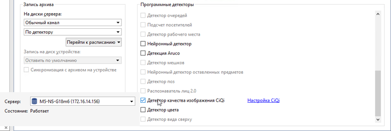 Для активации модуля необходимо в Настройках канала в области Программные детекторы выбрать пункт Детектор качества изображений CiQi и выбрать Сервер, который будет производить расчет аналитики.