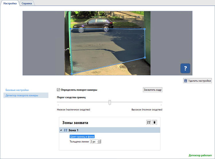 - Выбрать Зоны захвата - указать одну область изображения, которая будет анализироваться детектором для определения поворота камеры. Установка правильной зоны захвата может повысить точность анализа и исключить ненужные объекты или фон из рассмотрения.