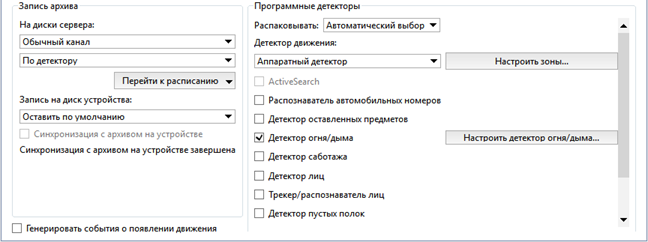 Для подключения и настройки детектора огня/дыма необходимо в Настройках канала установить флаг Детектор огня/дыма и нажать на кнопку Настроить детектор огня/дыма...