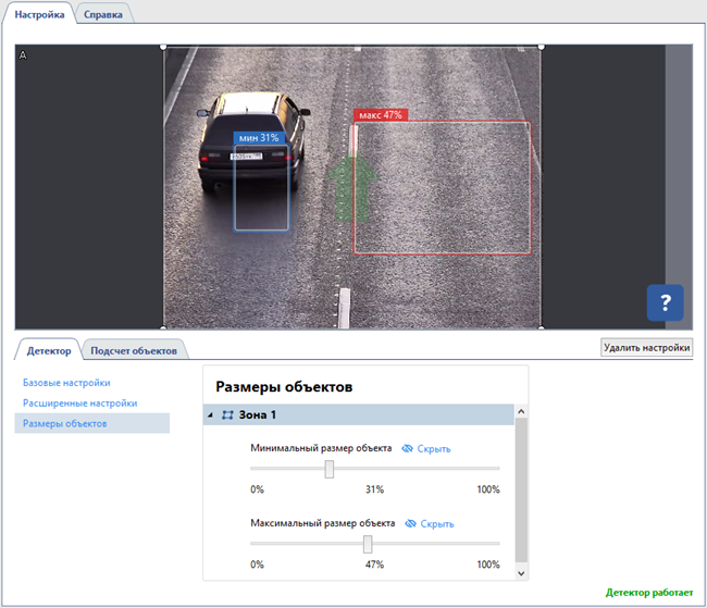 В пункте Размеры объектов вы можете создать зону, в которой будет производиться обнаружение транспортных средств. При помощи настроек Минимальный размер объекта и Максимальный размер объекта необходимо выбрать наибольший и наименьший размеры детектируемых объектов.