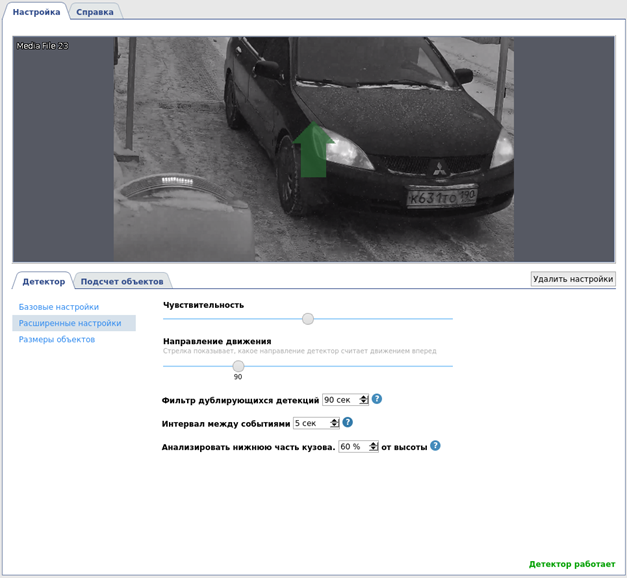 В параметре Направление движения задаётся направление движения потока, которое будет принято детектором за движение вперед. Направление указано зелёной стрелкой на видео, а ползунок отображает его значение.