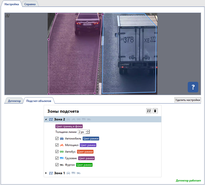 На вкладке Подсчёт объектов необходимо определить зоны, в которых будет происходить обнаружение транспортных средств, и задать их границы. Для создания