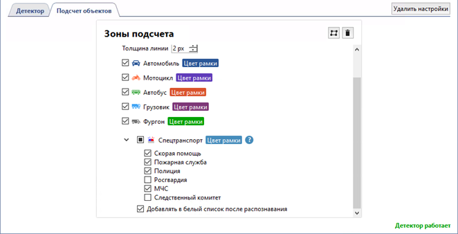 Для этого необходимо включить флаг Спецтранспорт и указать типы спецтранспорта для обнаружения.
