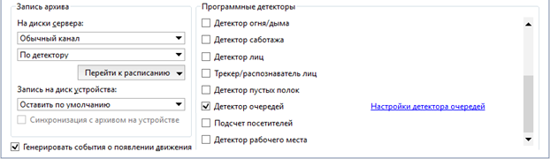 Для активации модуля необходимо в Настройках канала в области Программные детекторы выбрать пункт Детектор очередей. Для открытия окна настройки нажмите на ссылку Настройки детектора очередей.