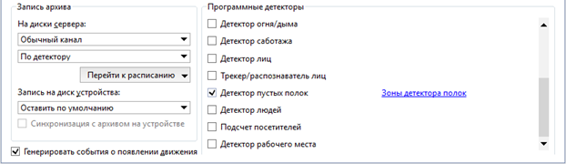 Для настройки зон детектора полок необходимо в Настройках канала в области Программные детекторы выбрать пункт Зоны детектора полок. Для открытия окна настройки нажмите на ссылку Зоны детектора полок.